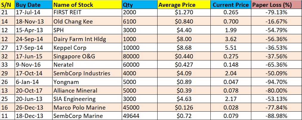 As you can see from the above table, most of my losses range between 36.53% to 94.70%. I still hold onto these stocks today as most of my initial capital is already wiped out due to the huge drop in share price. Despite averaging down over the years, the total loss in this portfolio is still at 6 figures. The only silver lining is that some stocks are still paying dividend at a higher interest rate than what the banks are giving but it will take forever to get my capital back.