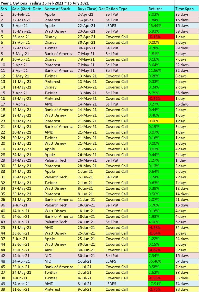 The below 2 tables show my records of options trading from 26 Feb 21, where I sold my first PUT options contract on Apple, to the present day. Since my investment year ends on 14 July, that also concluded my short first year of options trading from 26 Feb 21 to 15 July 21.