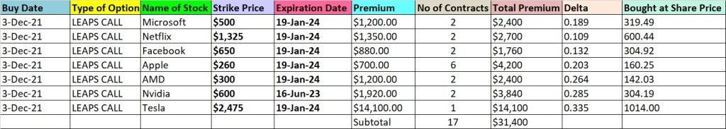 With the profits, capital released and my spare capital, I spent USD31.4k to buy 17 LEAPS contracts on the stocks that I have strong conviction in. They include Microsoft, Netflix, Apple, Facebook AMD, Nvidia and Tesla. Most of these LEAPS contracts will expire on Jan 2024, which is 2 years from now. That will give me a long enough runway for these tech and semiconductors giants to rise in value for both share price and premium price. If the worst happens, e.g. a market crash occurs in the coming weeks, I will continue to average down and buy the dip, using the spare capital release from cutting the losses on my legacy stocks.