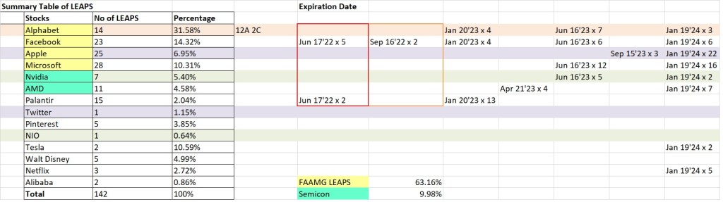 As mentioned in the last update, my immediate plan is to sell off those LEAPS that expire the soonest, i.e. Jun 22 and Sept 22 LEAPS (in the red and orange boxes) and then add on new LEAPS that expire furthest away.