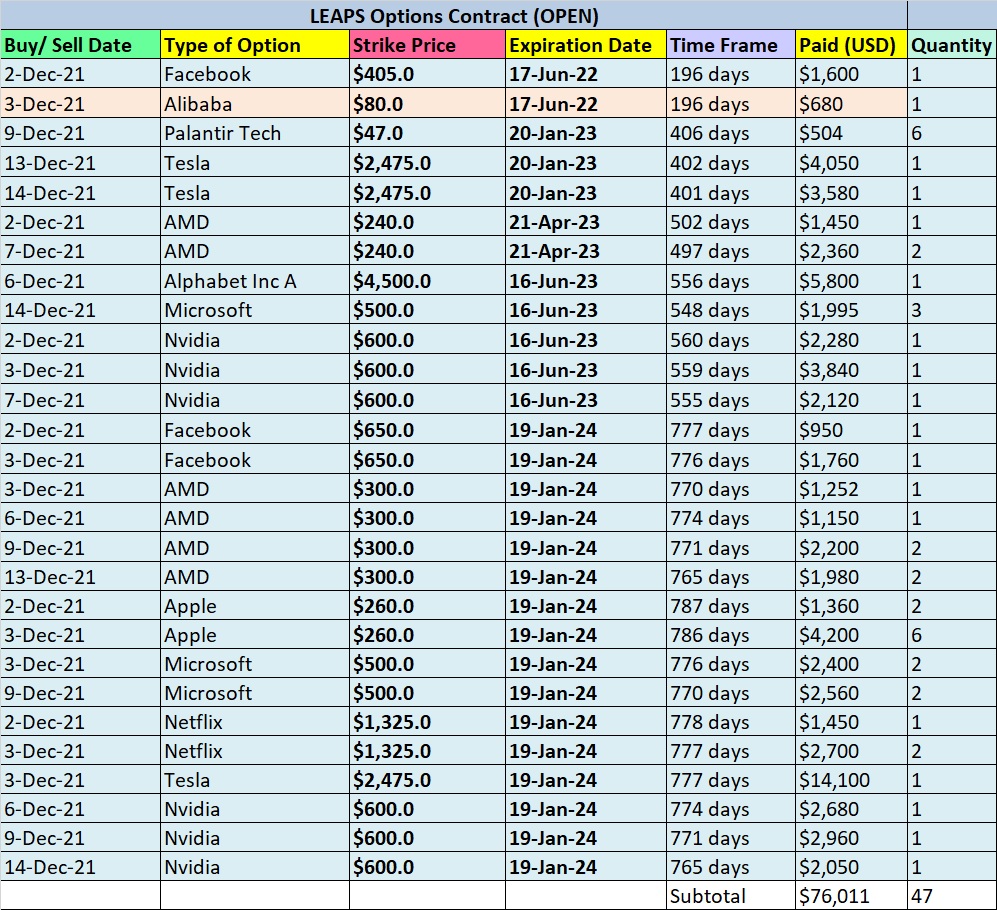 The below table is a summary of the LEAPS contracts that I bought in December 2021. More details such as delta, share price when I purchase the LEAPS options can be found in this post.