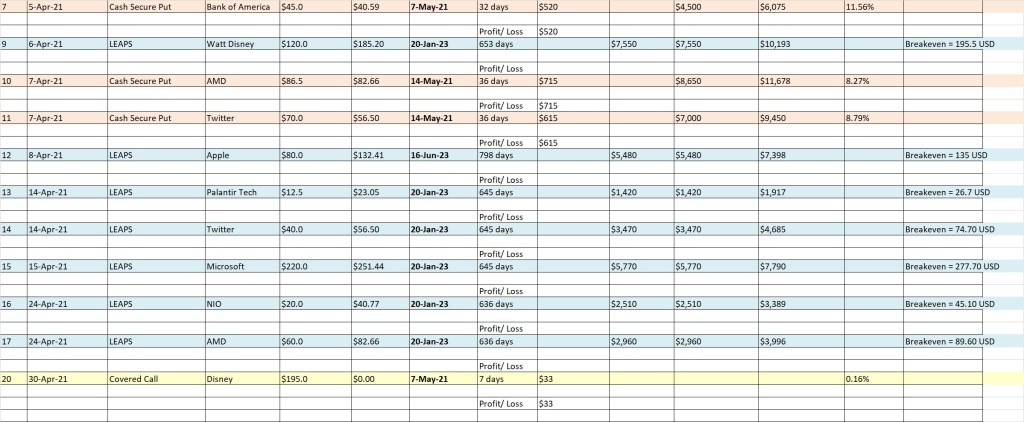 In April 21, I started buying LEAPS and sold covered call for my Disney shares as the previous PUT contract was exercised and I own 100 shares of Disney now. I also sold off some bonds that I was holding and bank stocks (OCBC) to raise more funds for my trading capital.