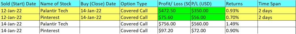 As the share prices of my covered call stock positions continue to fall, it is a good thing for the options seller (me) as the premium will drop and I can buy the contract back at a lower price to close it. I close my covered call positions in Palantir and Pinterest to lock in profits and earn $400 in 2 days while the stocks are falling!