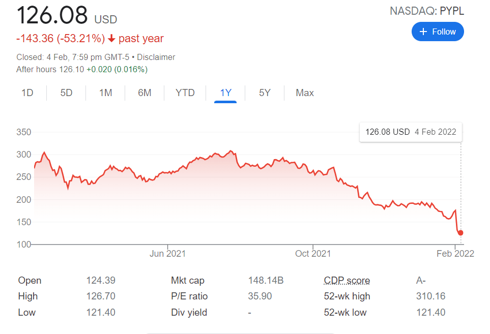 There are other examples such as Paypal, which dropped 53% from its price one year ago.