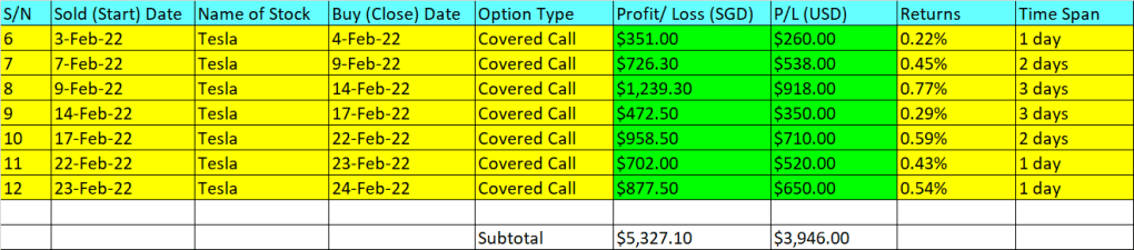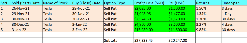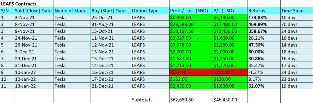 As you can see from the profit table above, in just 11 contracts (including one that resulted in a loss), I have managed to earn SGD62,68k (USD46.43k). This is all thanks to Tesla’s phenomenal run to an all-time high of USD1,243 sometime in Nov 2021.
