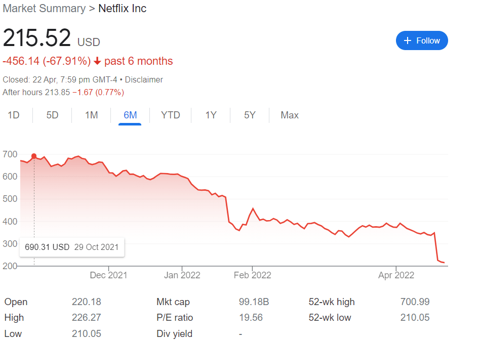 Netflix’s share price plunges more than 36% after its dismal quarter earnings were released on 20th April 22, where it reported a net loss of 200,000 subscribers. The once-mighty FAANG stock has dropped almost 70% of its share price since the all-time high of USD700.99 less than 6 months ago.