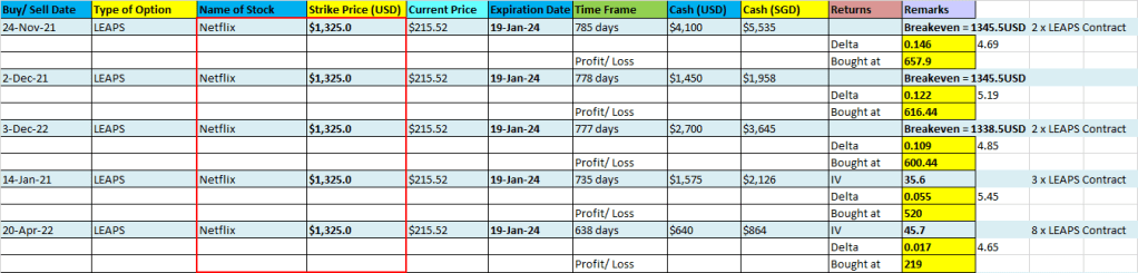 I do not own any Netflix shares but I do have 16 LEAPS CALL option contracts (8 of which was bought recently when the share price dropped 35%) expiring in Jan 2024. My total costs in these contracts add up to SGD14.13k, which made up 3.27% of my total LEAPS Portfolio funds allocation.