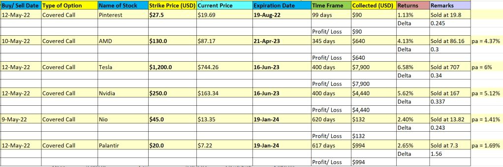 I opened up new Covered CALL positions when the market was showing signs of a rebound. It was a good opportunity to collect more premium when share prices rise. As covered call option contract sellers, we want to sell covered call option contracts when the share price is higher to earn more premium and cash in when the share price drops, as it translate to a drop in premium, for us to buy back a lower price.
