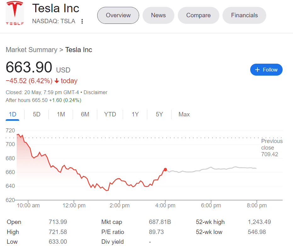 The US stock market continued to fall on 20th May 22 before staging a late comeback to close mixed. One of the stock that got hammered on Friday’s session was Tesla. It was at one stage down more than USD70 before rising to close at a day loss of USD45.52.
