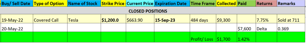 On 19th May, I sold a Tesla CALL option contract and received USD9.3k. It was a 7.75% returns for a 484-day contract. However, due to drop in share price for Tesla on 20th May, the premium fell by USD1,700 when Tesla’s share price was down USD50. So, I closed the contract and locked in USD1.7k profits. That was a 1.42% return in a day as compared to 7.75% return for 484 days.