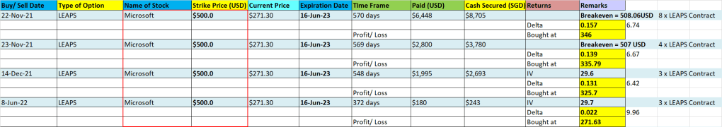 I started to execute what I have outlined in my previous post, on how I intend to save my LEAPS portfolio, by investing a small amount of capital in new LEAPS CALL contracts to average down on the current positions that are expiring from June 2023 to Jan 2024.