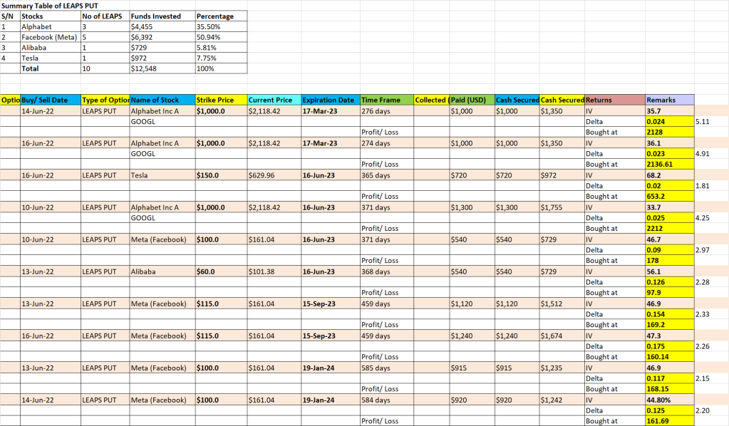 If 2022 is going to be the opposite of 2021, then we have to reverse the strategies used in 2021 to make money in 2022. In 2021, I used the LEAPS CALL strategy to earn more than 80% of my total returns in trading. However, I was too late to exit in 2022 and was down 90% on my 453k LEAPS CALL portfolio. If this year is going to be on a downtrend, then the LEAPS PUT strategy may just help to generate good returns. I am using the spare cash accumulated from making fewer trades in the past few weeks and those premiums generated from doing the Wheel strategy to fund and build up my new LEAPS PUT portfolio. Hopefully, it is not just a hedge and can help me generate good returns in 2022 as well.