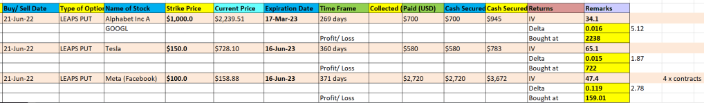 When the whole tech sector rallied but Meta (Facebook) was in the red, I worried for the future of this company, especially when I have a bunch of Meta CALL options contracts expiring in Sep 2022. That is why I increased my capital on Meta PUT contracts and bought 4 LEAPS PUT contracts expiring in June 2023, to claw back some capital when the CALL options expire worthless in Sep 2022.