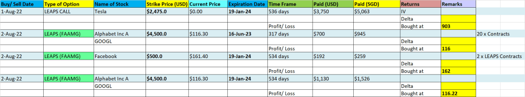 When I looked at my top 6 biggest losses, 3 of them come from my Jan 24 LEAPS CALL options on Tesla and Alphabet. It was due to the fact that I bought these LEAPS CALL at high premium prices last year, when the stock market was at its all-time-high and there was much time value in the contract. I am not too concerned about the stock holdings as I am confident they will still exist in the next 5 years.