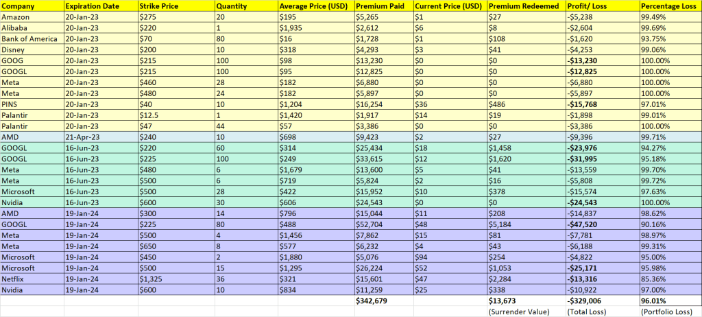 5 months ago when I was sharing about my 618k unrealised loss, I mentioned that what is worse than accumulating this amount of loss is that there were up to 453k worth of CALL options contracts that would eventually expire worthless if the market does not recover by Jan 2023.
