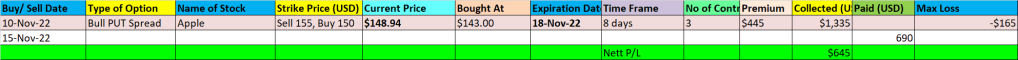 Over the next few days, the share price eventually rose to $148 and I closed the contracts with a profit of USD645, which is 390.91%, assuming my max loss of USD165 is my invested capital.