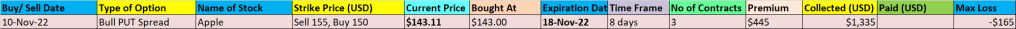 I opened the positions when Apple was trading at USD143 and the contracts expire in about a week’s time. I wasn’t expecting Apple to close above USD155 for my max profits as there is a high chance that they may expire worthless (if Apple closes below USD150).