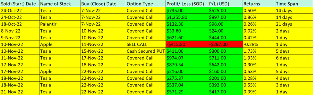 The loss from selling Apple PUT wiped out half of my profits for November 2022. The other half of November’s profits was wiped out when the Apple CALL contracts that I bought lost half their value when Apple kept falling in share price too. I sold them all at a loss when I anticipated that there would be a bigger selloff coming up.
