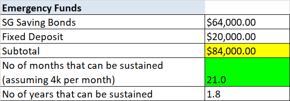 The current funds’ allocation that I have for emergency funds is around 14% but I am trying to build 100k reserves into Bonds and Fixed Deposit (FD), which would last me around 2 years of family expenses in the worst case that I lose my job or all shares go to zero. I previously calculated that my family’s monthly expenses are around $4,000. I currently have 84k already in Singapore Savings Bonds and Fixed Deposits. These are capital guarantees and I can withdraw the funds in a short period (at most 1 month). If I do not need them, they will help to generate around an average of 2.5% to 3% of interest per annum.