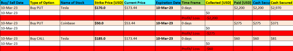 I was bearish on Tesla and Coinbase as I believe their share prices would fall. As a result, I bought very high risk 0 day PUT options (expiring on the same day 10 March 23), hoping to profit from a collapse in the share price of both companies. A PUT option, when predicted correctly, has unlimited upside for the option buyer. I tried to adopt the strategy that I learnt from the day trading group of using short expiration date and allowing the sudden share price movement to create an exponential increase in premium price.