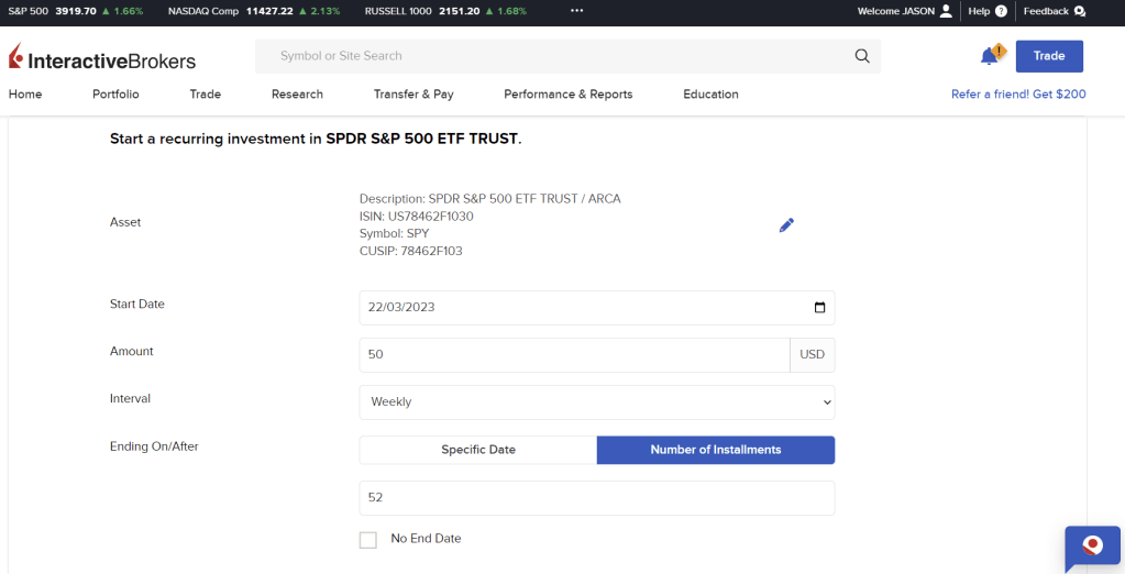 I mentioned about this at the start of the year that I intend to DCA into SPY over the whole of 2023 and eventually hit 100 shares to sell Covered CALL but I chickened out when I saw that the market was crashing, so I sold my SPY shares at a loss to preserve my capital. This time round, I intend to use the automatic recurring investment function inside Interactive Brokers (IBKR) platform to help me out so that I do not get distracted and abandon the plan again.