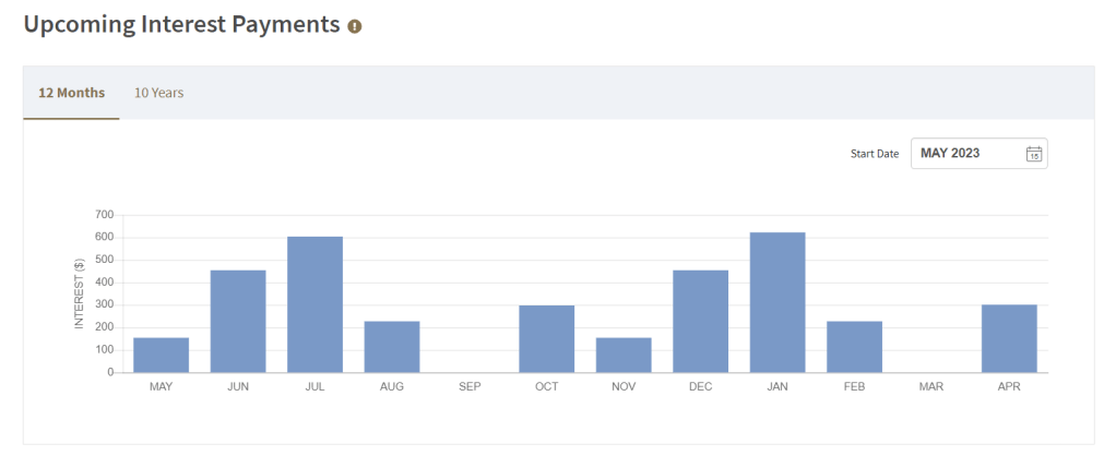 The below table shows my current payout for the next 12 months. If I do not redeem any bond, this will be the payout for the next 10 years.