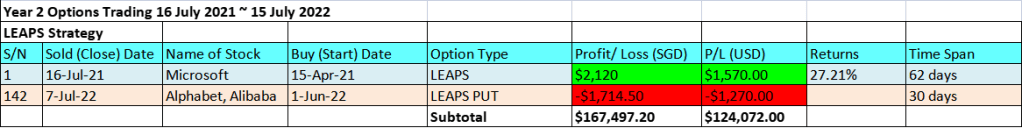 As my investing journey started from 16 July 2012, I have conveniently defined one full investing year to be from 16 July onwards to the 15 July of the following year. Thus, my year 1 options trading journey started on 26 Feb 21 and ended on 15 July 21.