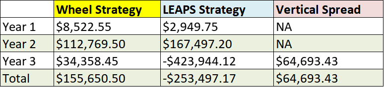 In Year 2, the LEAPS Strategy was a clear winner thanks to the wonderful bull run of 2022. The Wheel Strategy is behind by around 55k.