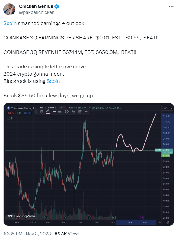 On 3 Nov 23, He also shared on X that crypto exchange, Coinbase’s share price was going to rocket up, following their 3Q earnings beat.