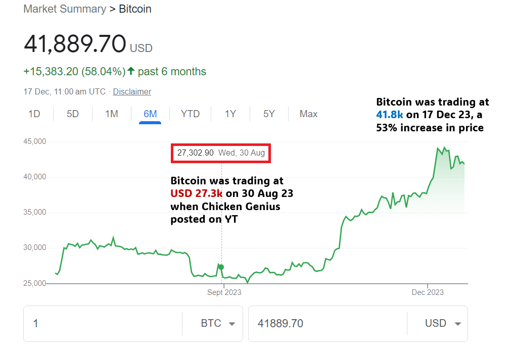 Chicken Genius Singapore aka Ken Teng first shared in his comeback video on YouTube 4 months ago (30 Aug 2023) that he was bullish on crypto.