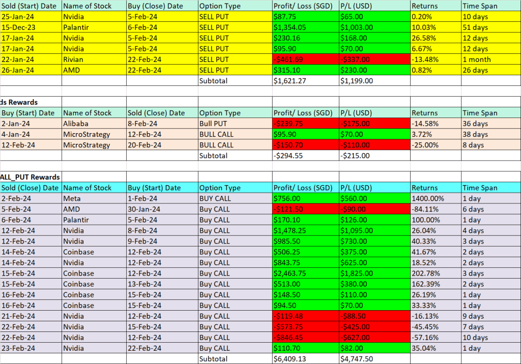 February 2024 has been a good month for me thanks to the rapid rise of a few stocks such as Nvidia and Coinbase. The summary table of profit/ loss is as follows: