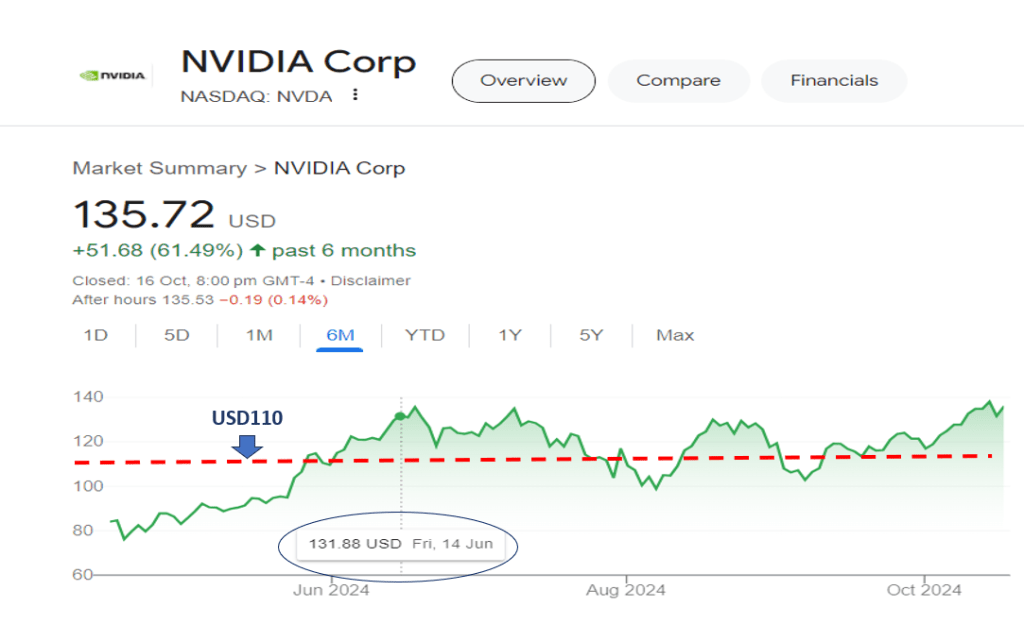 On 14 June 24, I started building up my BULL CALL Spread positions when Nvidia was trading around USD130+. I chose the USD110/108 strike prices to give myself a safety margin, just in case Nvidia drops below USD130.