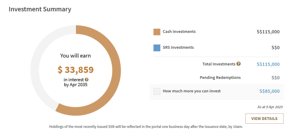 I applied S$35k of SSB in March 25 for April25 SSB and the full amount was assigned. Thus, I have S$115k of SSB in my account currently and have achieved 57.5% of my target.