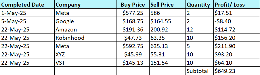 This is a summary of trades that I closed in May 25