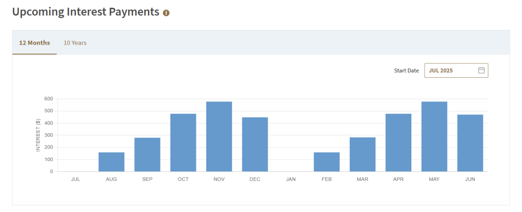 I am changing my plan to accumulate a total of $150k of SSB instead of the original plan of $200k. Therefore, the upcoming purchase of July25 SSB will be my last batch of purchase with $15k worth of bonds. After that is completed, I will still get a payout for every month for the entire year, However, some months will have a lower payout while some months will get a higher payout.